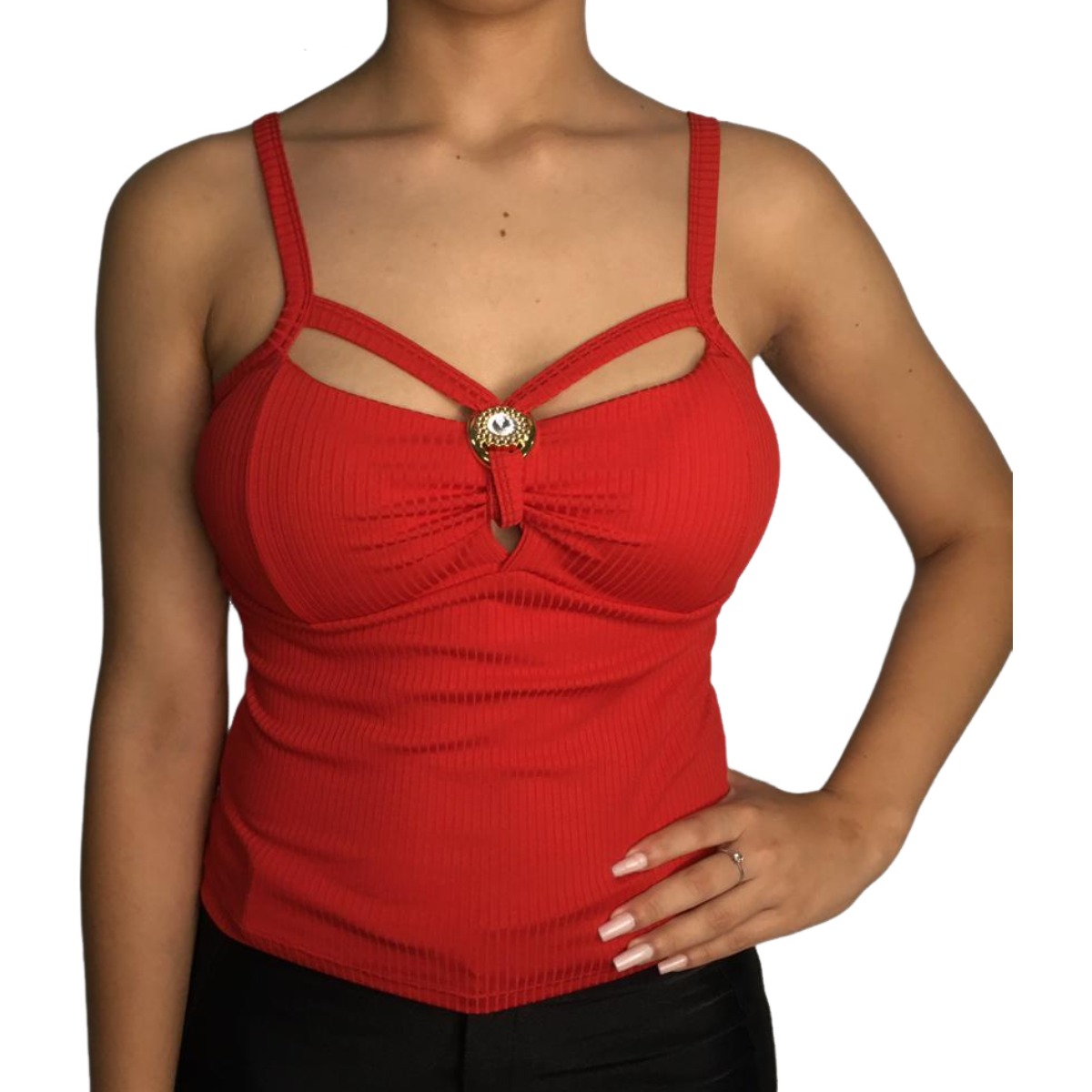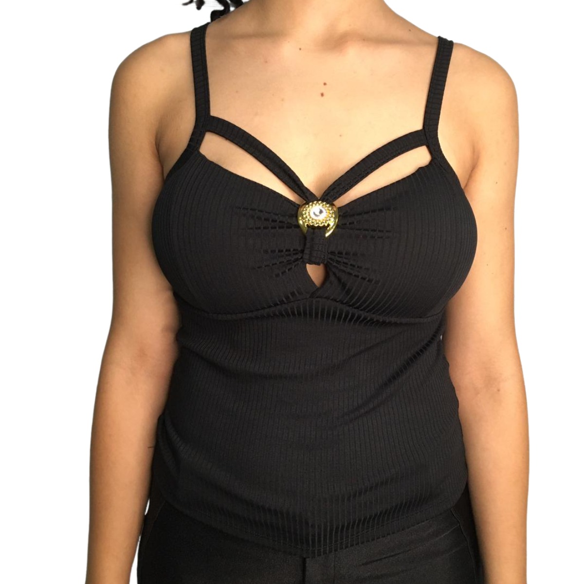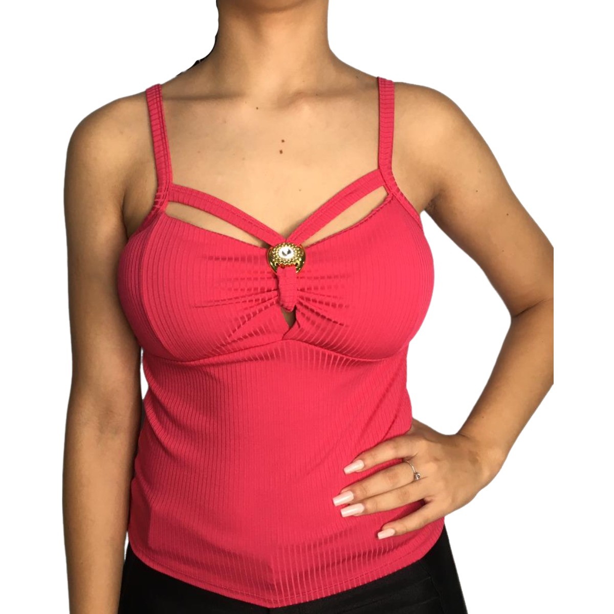 Com alças finas e recortes diferenciados no busto, o modelo conta ainda com detalhe decorativo central que destaca o colo e adiciona um toque moderno e estiloso ao visual. Versátil, combina facilmente com looks casuais ou produções mais sofisticadas, sendo ideal para o dia a dia, trabalho, passeios ou eventos informais.