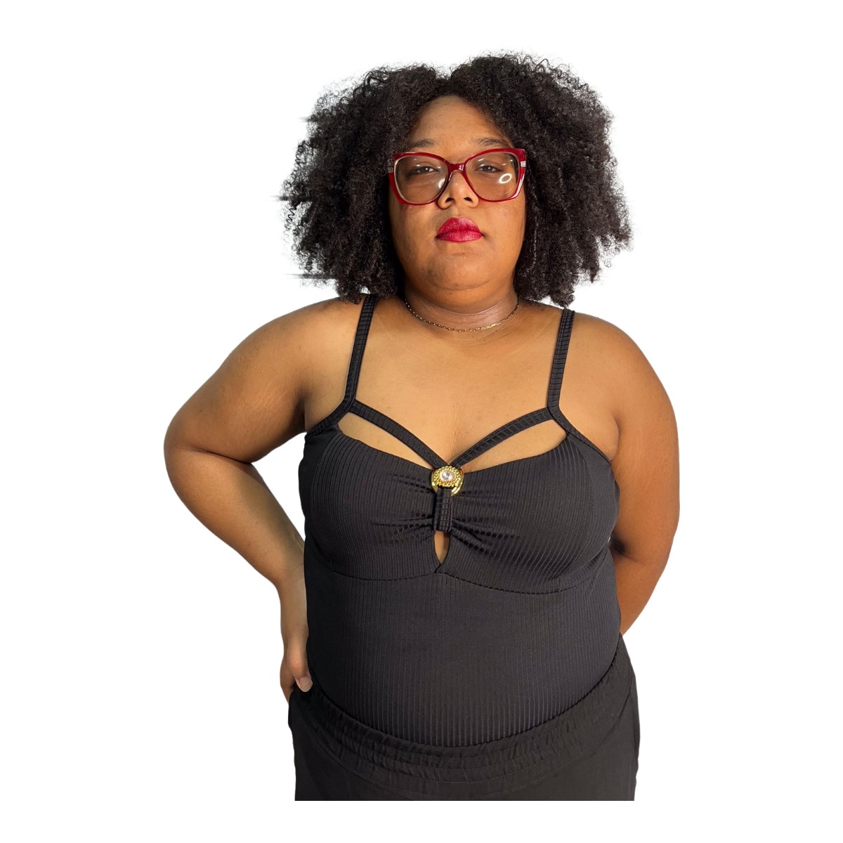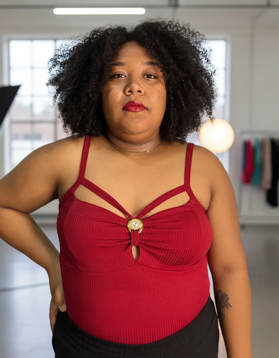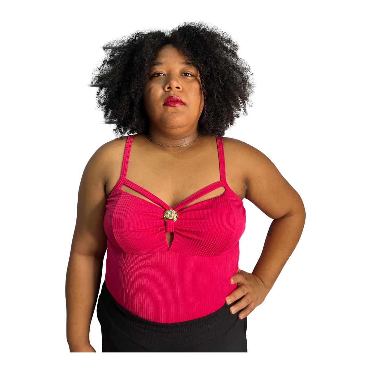 Blusa feminina confeccionada em 96% viscose e 4% elastano, oferecendo conforto, elasticidade e caimento perfeito. O modelo possui alças finas, recorte moderno no busto e detalhe decorativo central, que valoriza o colo com muito charme. O tecido canelado acrescenta estilo e destaca a silhueta de forma elegante.