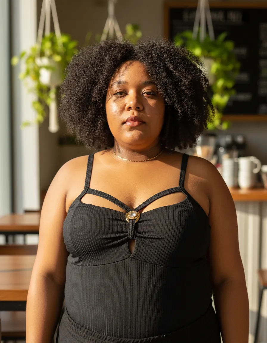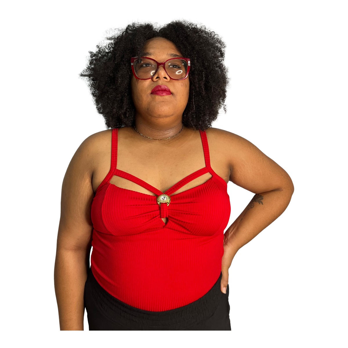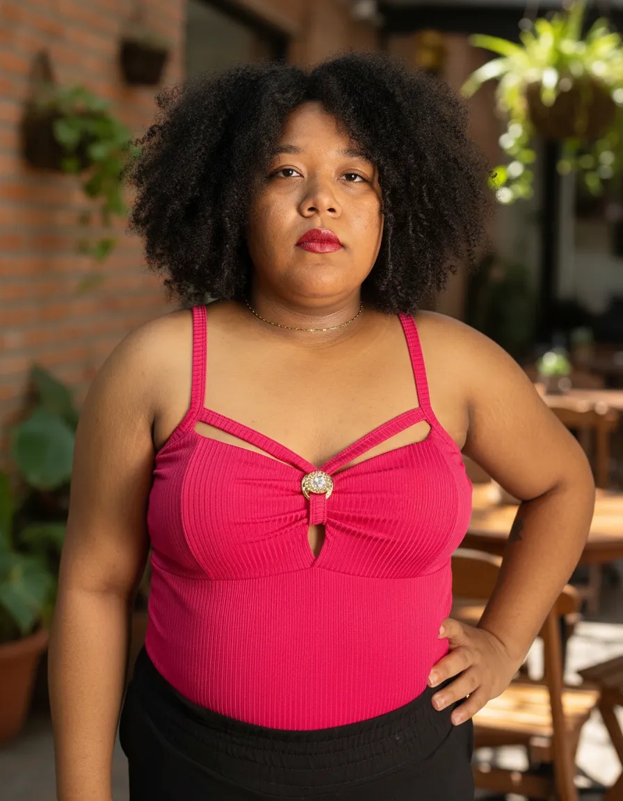 Possui alças finas, recorte moderno no busto e detalhe decorativo central, que realça o colo com charme e sofisticação. O tecido canelado confere um visual atual e versátil, perfeito para compor looks casuais ou mais elaborados em qualquer estação.