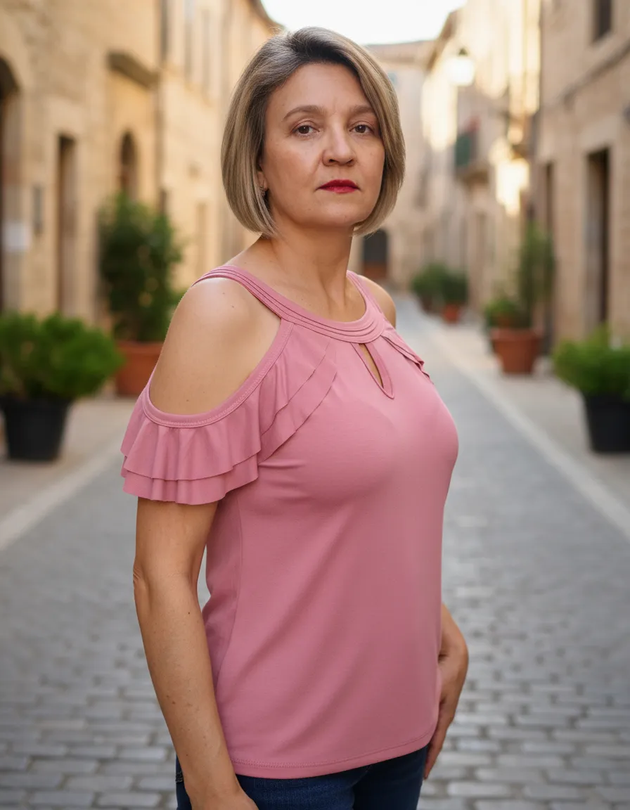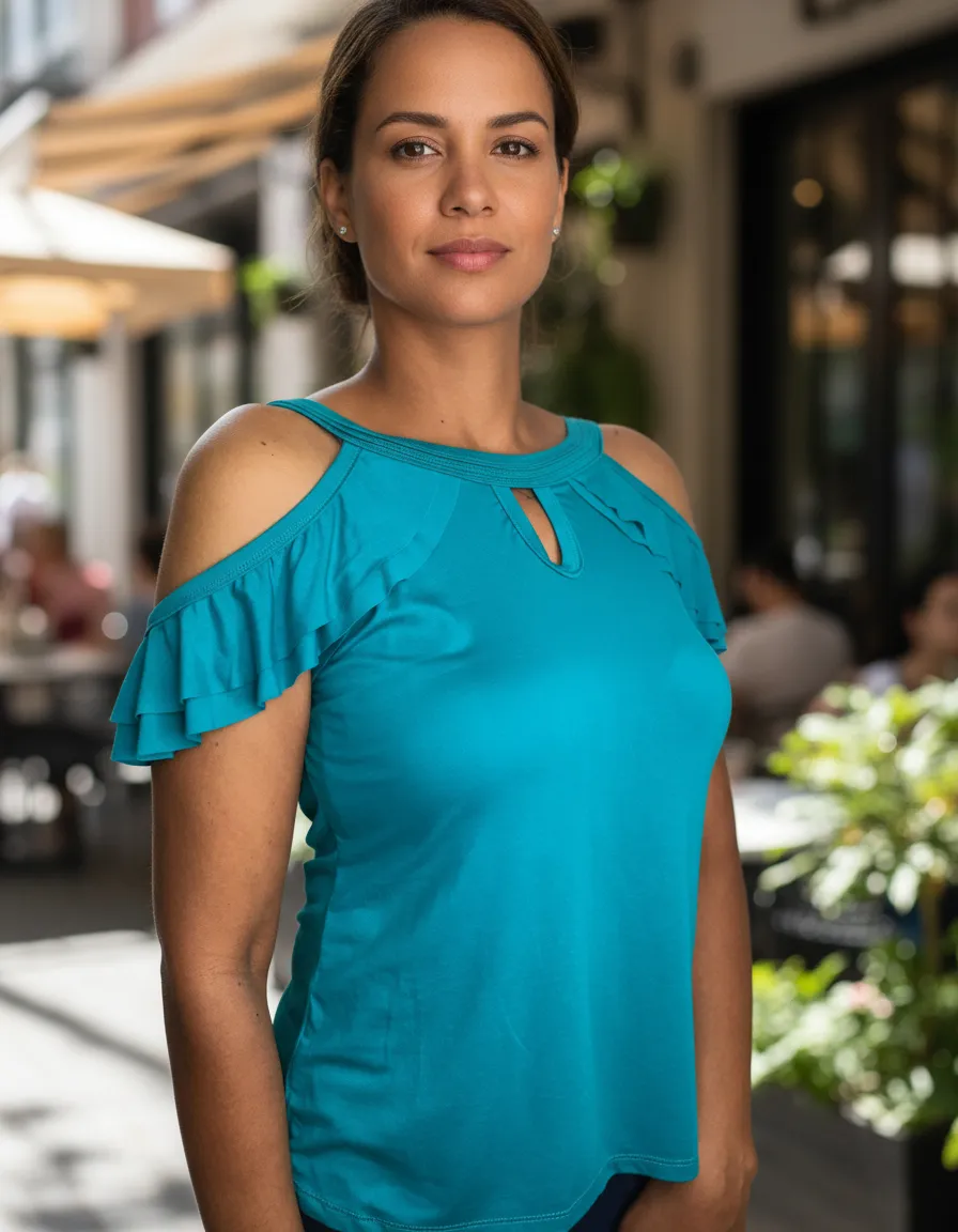 Blusa feminina confeccionada em 96% viscose e 4% elastano, com toque leve, macio e confortável. O modelo traz ombros vazados (ciganinha moderna) e detalhe em babados nas mangas, que conferem charme e feminilidade. O decote arredondado com recorte frontal adiciona um toque delicado e elegante. — ideal para compor looks frescos, estilosos e cheios de personalidade.