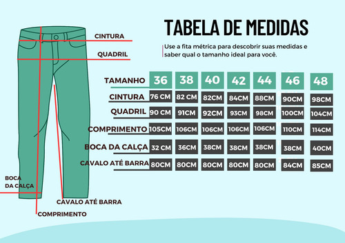 NUMERAÇÃO DA CALÇA: 48 - CINTURA: 98cm / QUADRIL: 104cm / COMPRIMENTO DA CINTURA ATÉ A BARRA: 114cm / CAVALO ATÉ A BARRA:85cm / BOCA DA CALÇA:40cm