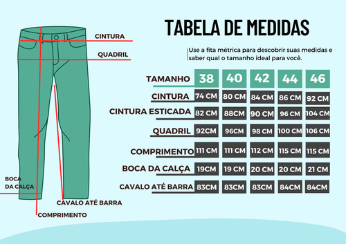 Calça RETA JEANS DESTROYED, modelagem confortável e mais solta, que permite a mobilidade aos movimentos. tecido leve com elastáno, proporcionando maior conforto. Estilo e conforto em uma modelagem só, com bolsos na frente, contém dois bolsos atras, tecido leve e confortável,perfeito para o dia-a-dia, e para usar em ocasiões especiais. COMPOSIÇÃO: Tecido: 83%Algodão, 15% Poliéster, 2% Elastano TABELA DE MEDIDAS CALÇA SHYROS: NUMERAÇÃO DA CALÇA: 38 - CINTURA: 74cm CINTURA ESTICADA: 82cm QUADRIL: 92cm COMPRIMENTO DA CINTURA ATÉ A BARRA: 111cm CAVALO ATÉ A BARRA:83m BOCA DA CALÇA:19cm NUMERAÇÃO DA CALÇA: 40 - CINTURA: 80cm CINTURA ESTICADA: 88cm QUADRIL: 96cm COMPRIMENTO DA CINTURA ATÉ A BARRA: 111cm CAVALO ATÉ A BARRA:83cm BOCA DA CALÇA:19cm NUMERAÇÃO DA CALÇA: 42 - CINTURA: 84cm CINTURA ESTICADA: 90cm QUADRIL: 98cm COMPRIMENTO DA CINTURA ATÉ A BARRA: 112cm CAVALO ATÉ A BARRA: 83cm BOCA DA CALÇA: 20cm NUMERAÇÃO DA CALÇA: 44- CINTURA: 86cm CINTURA ESTICADA: 96cm QUADRIL: 100cm COMPRIMENTO DA CINTURA ATÉ A BARRA: 115cm CAVALO ATÉ A BARRA: 84cm BOCA DA CALÇA:20cm NUMERAÇÃO DA CALÇA: 46 - CINTURA: 92cm CINTURA ESTICADA: 104cm QUADRIL: 106cm COMPRIMENTO DA CINTURA ATÉ A BARRA: 115cm CAVALO ATÉ A BARRA: 84cm BOCA DA CALÇA: 21cm Produto original com nota fiscal