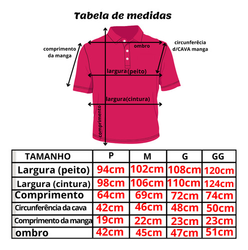 A Camisa POLO REI MALHAS PIQUET é produzida em malha 50% algodão, 50% Poliéster um tecido leve, que traz um caimento excelente. De toque macio e de alta qualidade, ela vai durar por muito tempo. A peça conta com mangas curtas e gola polo. Tem modelagem reta, uma peça perfeita para o dia-a-dia. COMPOSIÇÃO: 0% algodão, 50% Poliéster MARCA: REI MALHAS TABELA DE MEDIDAS: TAMANHO P: CIRCUNFERÊNCIA (PEITO): 106CM CIRCUNFERÊNCIA (CINTURA): 108CM COMPRIMENTO: 65CM OMBRO: 44CM COMPRIMENTO MANGA: 20CM CIRCUNFERÊNCIA CAVA DA MANGA: 44CM TAMANHO M: CIRCUNFERÊNCIA (PEITO): 108CM CIRCUNFERÊNCIA (CINTURA): 110CM COMPRIMENTO: 67CM OMBRO: 46CM COMPRIMENTO MANGA: 22CM CIRCUNFERÊNCIA CAVA DA MANGA: 46CM TAMANHO G: CIRCUNFERÊNCIA (PEITO): 114CM CIRCUNFERÊNCIA (CINTURA): 116CM COMPRIMENTO: 71CM OMBRO: 47CM COMPRIMENTO MANGA: 23CM CIRCUNFERÊNCIA CAVA DA MANGA: 50CM TAMANHO GG: CIRCUNFERÊNCIA (PEITO): 124CM CIRCUNFERÊNCIA (CINTURA): 126CM COMPRIMENTO: 72CM OMBRO: 48CM COMPRIMENTO MANGA: 24CM CIRCUNFERÊNCIA CAVA DA MANGA: 52CM PRODUTO ORIGINAL COM NOTA FISCAL