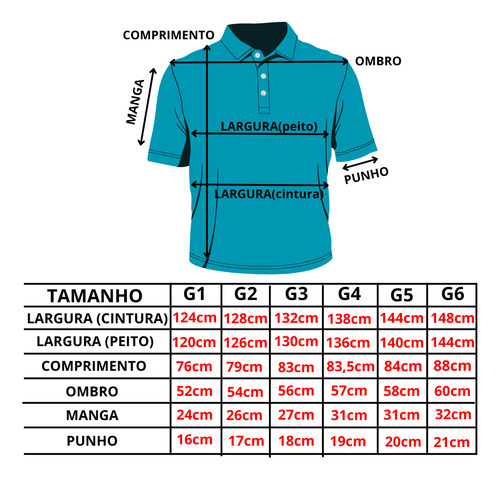 A Camisa POLO PIQUET World Class Tamanho Grande é produzida em malha 100% algodão, um tecido leve, que traz um caimento excelente. De toque macio e de alta qualidade, ela vai durar por muito tempo. A peça conta com mangas curtas e gola polo. Tem modelagem reta, uma peça perfeita para o dia-a-dia. ATENÇÃO PODE HAVER VARIAÇÃO NO SIMBOLO COMPOSIÇÃO:MALHA 100% ALGODÃO TABELA DE MEDIDAS: TAMANHO G1: LARGURA (CINTURA): 62 x 2 = 124CMLARGURA (PEITO): 60 x 2 = 120CMCOMPRIMENTO: 76CMOMBRO: 52CMMANGA: 24CMPUNHO: 16CM TAMANHO G2: LARGURA (CINTURA): 64 x 2 = 128CMLARGURA (PEITO): 63 x 2 = 126CMCOMPRIMENTO: 79CMOMBRO: 54CMMANGA: 26CMPUNHO: 17CM TAMANHO G3: LARGURA (CINTURA): 66 x 2 = 132CMLARGURA (PEITO): 65 x 2 = 130CMCOMPRIMENTO: 83CMOMBRO: 56CMMANGA: 27CMPUNHO: 18CM TAMANHO G4: LARGURA (CINTURA): 69 x 2 = 138CMLARGURA (PEITO): 68 x 2 = 136CMCOMPRIMENTO: 83,5CMOMBRO: 57CMMANGA: 30CMPUNHO: 19CM TAMANHO G5:LARGURA (CINTURA): 72 x 2 = 144CMLARGURA (PEITO): 70 x 2 = 140CMCOMPRIMENTO: 84CMOMBRO: 58CMMANGA: 31CMPUNHO: 20CM TAMANHO G6:LARGURA (CINTURA): 74 x 2 = 148CMLARGURA (PEITO): 72 x 2 = 144CMCOMPRIMENTO: 88CMOMBRO: 60CMMANGA: 32CMPUNHO: 21CM PRODUTO ORIGINAL C/NOTA FISCAL