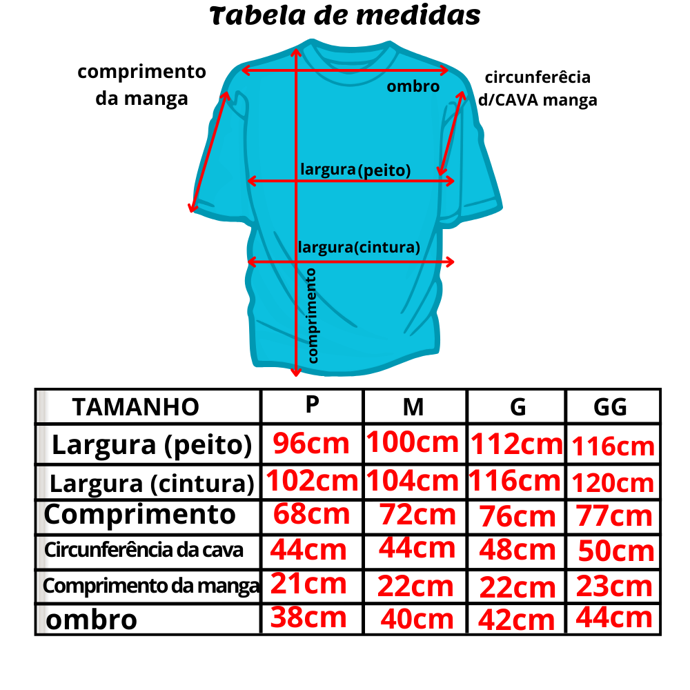 Eleve o seu estilo esportivo e garanta o máximo de conforto e desempenho com nossas Camisetas Dry fit Masculinas. Desenvolvidas para homens dinâmicos que valorizam a qualidade em suas práticas esportivas, estas camisetas oferecem uma combinação única de funcionalidade e estilo. COMPOSIÇÃO:100% POLIESTER TABELA DE MEDIDAS MEDIDAS EQUIVALENTES AO TAMANHO P: LARGURA (PEITO): 48 x 2 = 96cm LARGURA (CINTURA): 51 x 2 = 102cmCOMPRIMENTO: 68CIRCUNFERÊNCIA CAVA MANGA: 44cmCOMPRIMENTO MANGA: 21cmOMBRO: 38cm MEDIDAS EQUIVALENTES AO TAMANHO M: LARGURA (PEITO): 50 x 2 = 100cm LARGURA (CINTURA): 52 x 2 = 104cmCOMPRIMENTO: 72CIRCUNFERÊNCIA CAVA MANGA: 22 x 2 = 44cmCOMPRIMENTO MANGA: 22cmOMBRO: 40m MEDIDAS EQUIVALENTES AO TAMANHO G: LARGURA (PEITO): 56 x 2 = 112cm LARGURA (CINTURA): 58 x 2 = 116cmCOMPRIMENTO: 76CIRCUNFERÊNCIA CAVA MANGA: 24 x 2 = 48cmCOMPRIMENTO MANGA: 22cmOMBRO: 42m MEDIDAS EQUIVALENTES AO TAMANHO GG: LARGURA (PEITO): 58 x 2 = 116cm LARGURA (CINTURA): 60 x 2 = 120cmCOMPRIMENTO: 77CIRCUNFERÊNCIA CAVA MANGA: 25 x 2 = 50cmCOMPRIMENTO MANGA: 23cmOMBRO: 44m PRODUTO ORIGINAL C/NOTA FISCAL