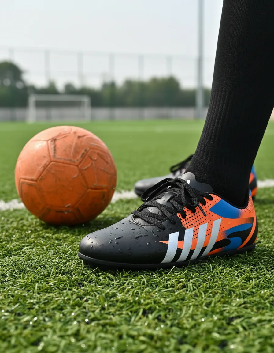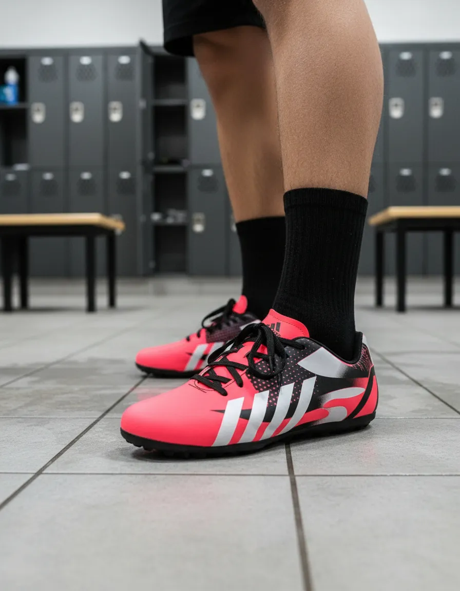 A sola de borracha antiderrapante oferece tração superior, estabilidade e segurança, permitindo mudanças rápidas de direção e acelerações explosivas nas partidas de futebol society.