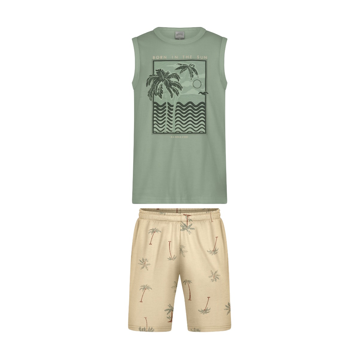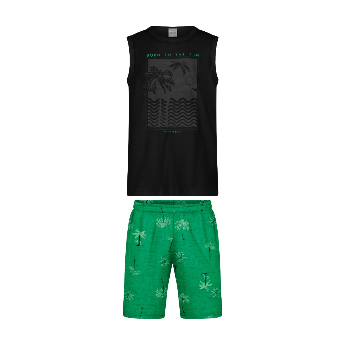 O Conjunto Infantil Alakazoo Masculino é ideal para os dias de sol e muita diversão! Com regata em meia malha penteada, o modelo traz uma estampa cheia de aventuras, perfeita para os pequenos exploradores.
