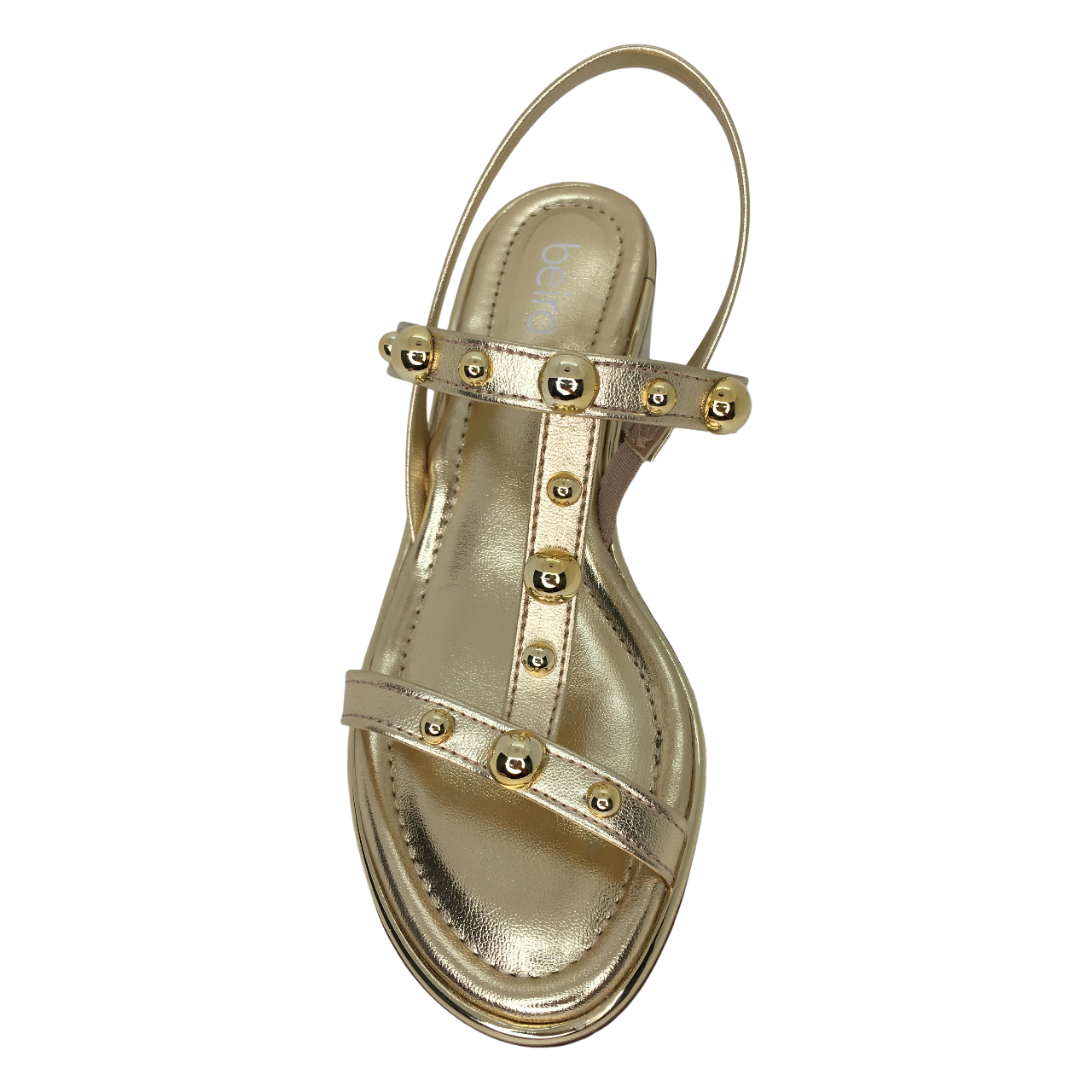 - Modelagem: Slingback com bico alongado, tiras frontais delicadas e detalhe dourado metálico