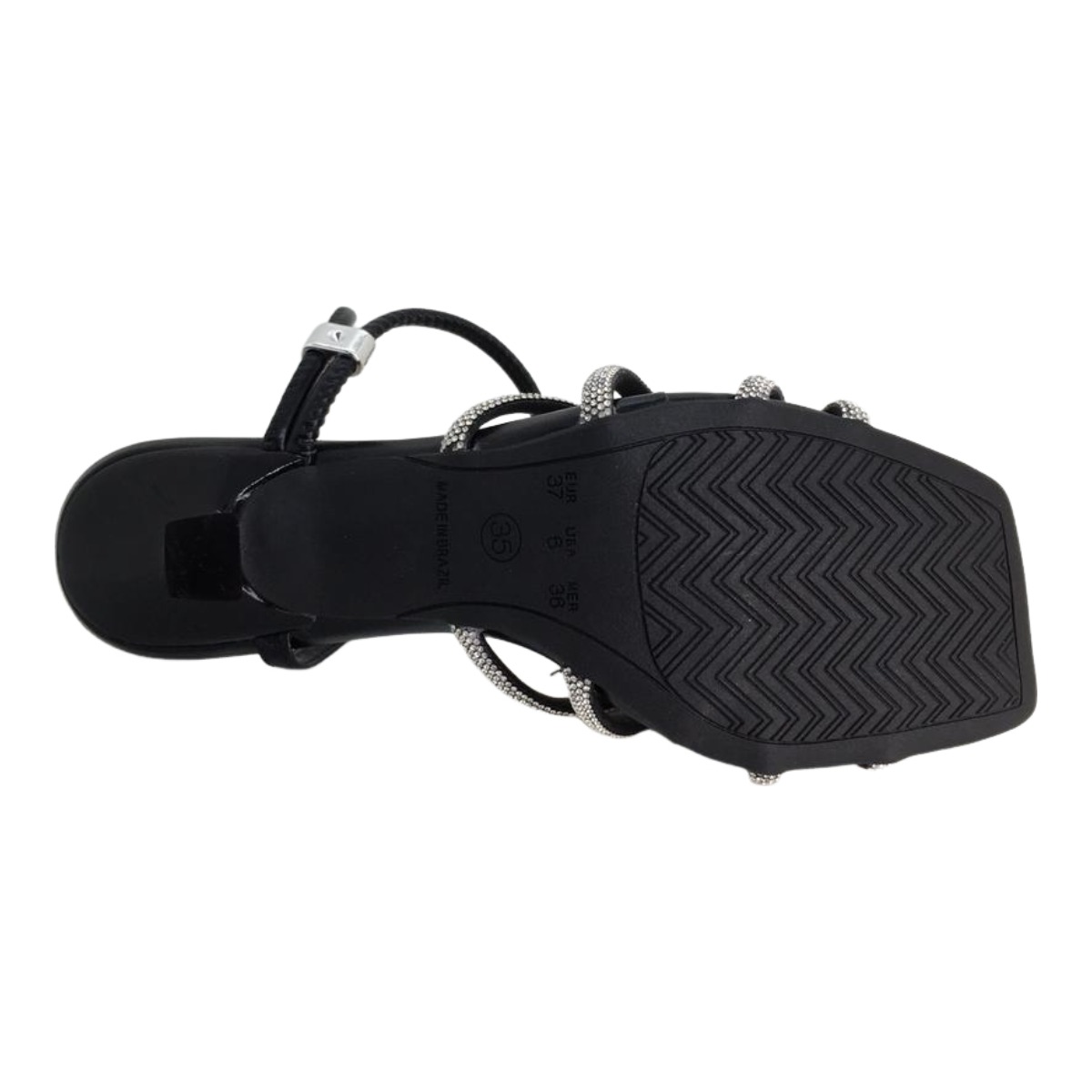 O cabedal em napa sintética de alta qualidade recebe tiras cruzadas com aplicação de strass, seguindo a tendência shine minimal, que valoriza o visual com delicadeza e requinte.