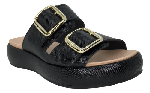Suas duas fivelas metálicas ajustáveis garantem um ajuste perfeito ao pé, enquanto o solado elevado com base antiderrapante proporciona conforto e segurança em cada passo. O salto plataforma de 4 cm oferece estabilidade, ideal para uso prolongado sem abrir mão do estilo.