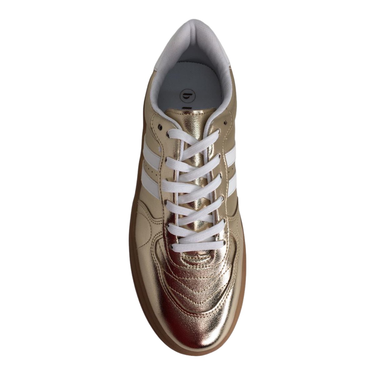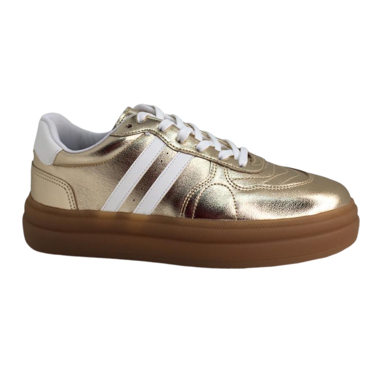Descubra o estilo moderno e urbano do Tênis Casual Feminino Bebecê. Confeccionado em material sintético com acabamento metalizado, o modelo traz um toque fashion com listras laterais e solado flatform em tom caramelo, que garante conforto e versatilidade.