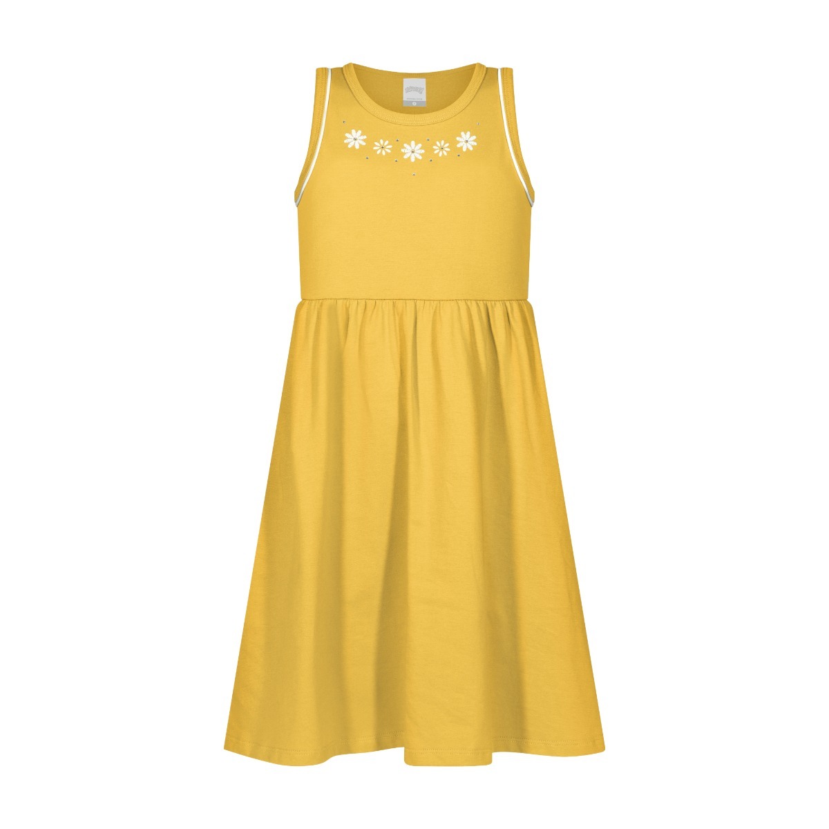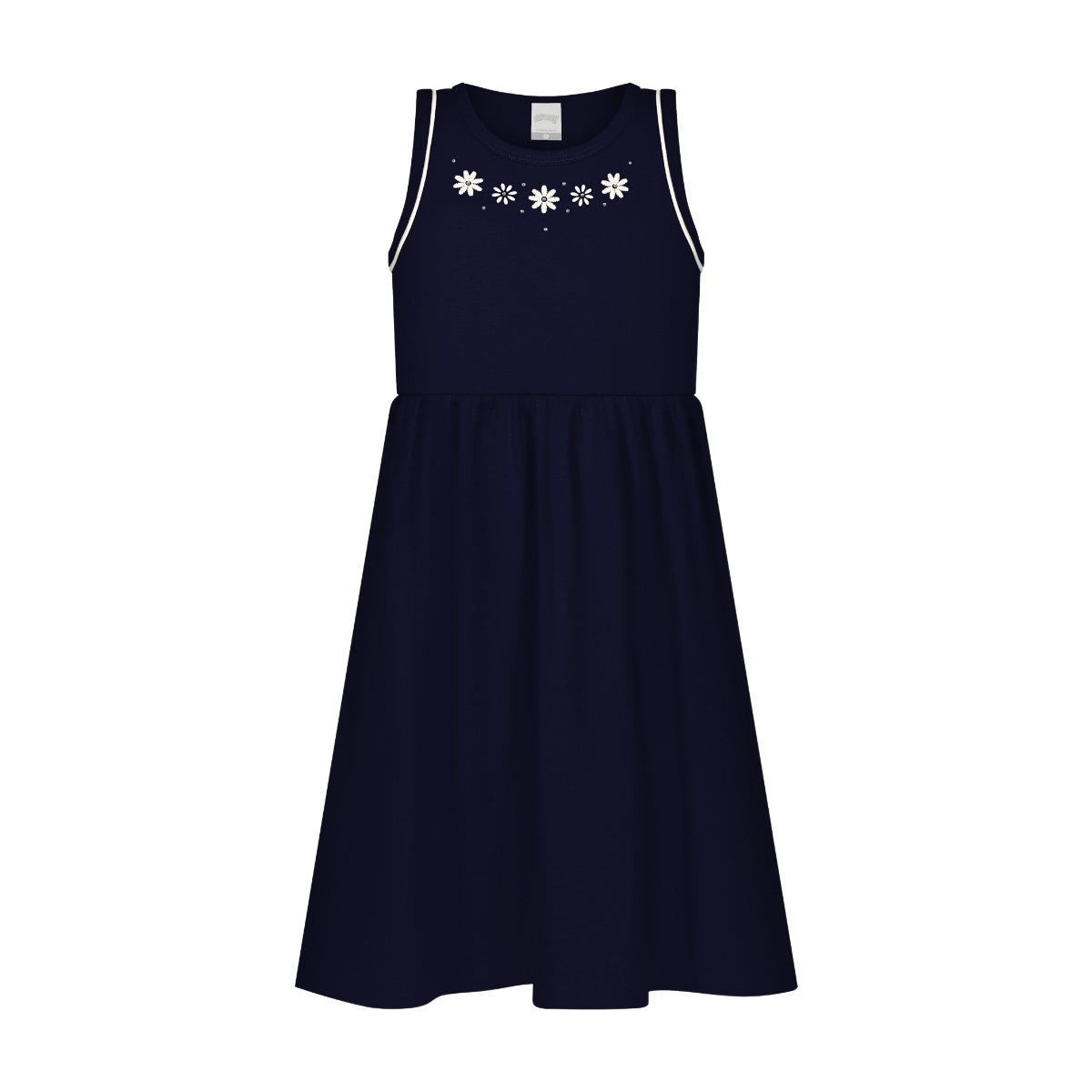 Produzido em meia malha penteada 100% algodão, o vestido oferece toque macio e respirável, além de ser feito com algodão responsável, contribuindo para uma produção com menor impacto ambiental. Conta ainda com comprimento curto, gola redonda e estampa localizada com strass, unindo estilo, delicadeza e sustentabilidade.