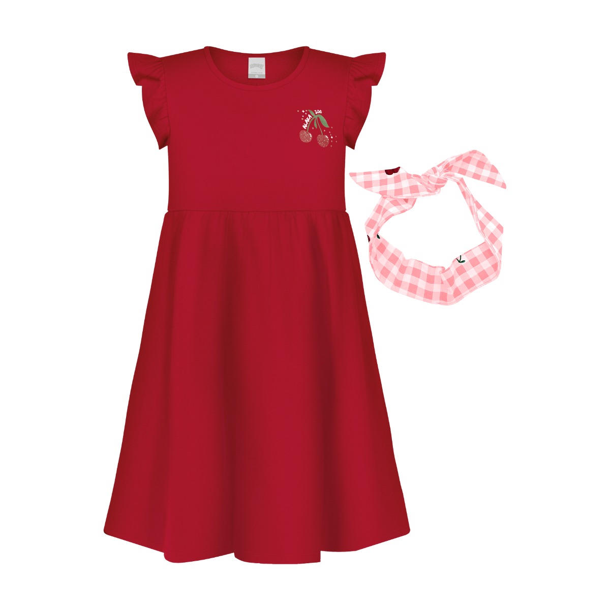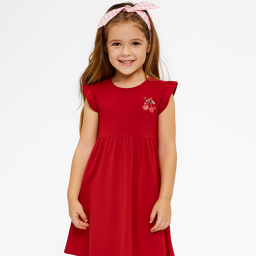 1 (Par) Vestido Alakazoo Infantil Rodado Com Manga Faixa Detalhe Bordado Cereja