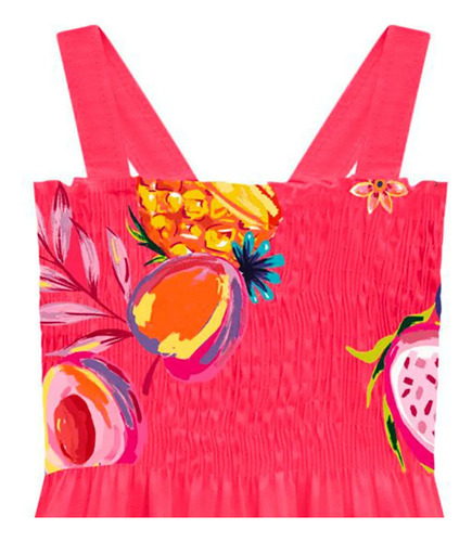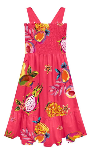 O Vestido Infantil Nanaié confeccionado em cambraia, possui decote em lastex, alça com debrum, recorte de pala com franzido, estampa rotativa com frutinhas e recorte na barra com babados.