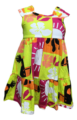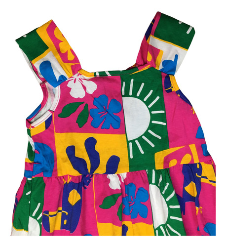 O Vestido Infantil Nanaié confeccionado em meia malha, possui modelagem soltinha, recorte com franzido na pala e barra, manga dupla, estampa rotativa e acabamento no decote com derbum.